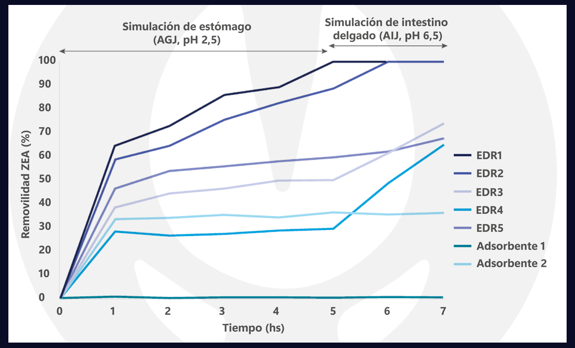 En el ensayo, se observó que los adsorbentes no mostraron una buena eficacia sobre la ZEA, eliminando menos del 40 % del desafío inicial. Por otro lado, los productos enzimáticos presentaron una mayor eficiencia de eliminación, con diferencias notables según el pH de acción de las enzimas (Figura 2).