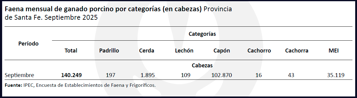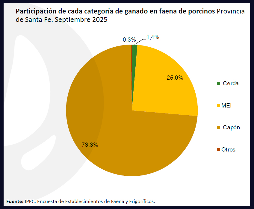 El documento precisa que “la categoría más faenada en porcinos, en septiembre de 2025, fue Capón con una participación de 73,3%”, seguida por otras categorías menores como MEI (macho entero inmunocastrado) y cerdas. Este predominio de animales de terminación refleja la consolidación del sistema productivo provincial.