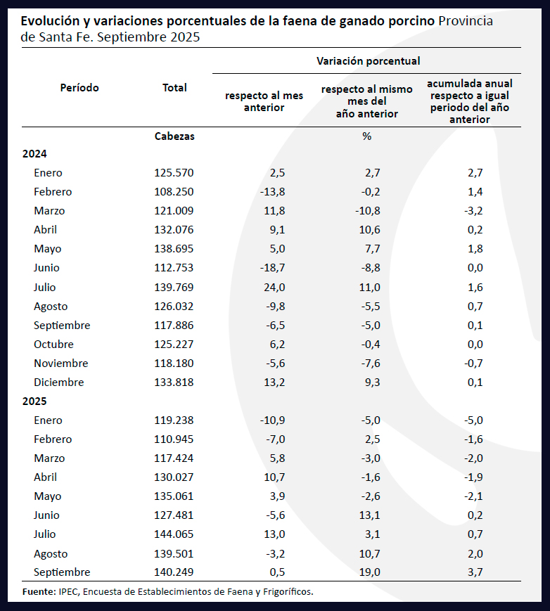 El Instituto Provincial de Estadística y Censos (IPEC) publicó hoy su último informe sobre la faena de septiembre en Santa Fe, que muestra un fuerte incremento en la faena porcina, con 140.249 cabezas y un alza interanual del 19%.