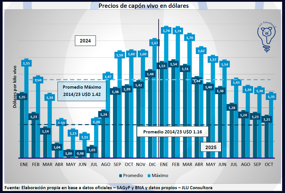 El Informe ISP N°100 de JLU Consultora, elaborado por el Ing. Zoot. Juan Luis Uccelli, señala: “El precio dolarizado del cerdo en pie siguió marcando una baja del 2.2%, mientras en pesos el alza fue del 0.7%”. A pesar del leve incremento en moneda local, el valor continúa “por debajo del promedio de los últimos 10 años y es un 15.7% inferior a octubre de 2024”.