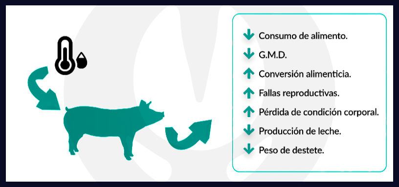 La disminución del consumo de alimento afecta directamente la ganancia de peso y la producción de leche en cerdas durante la lactancia. Sin embargo, el bajo consumo no explica el 100% de las consecuencias negativas del estrés por calor sobre la producción.