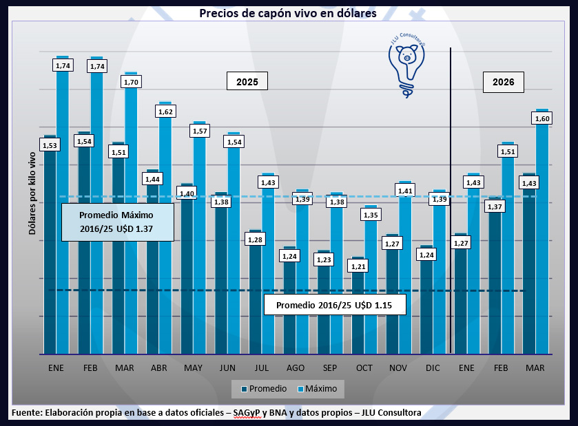 Durante marzo el precio del capón en Argentina mostró una mejora en dólares, impulsado por la suba del valor en pesos y la evolución del tipo de cambio. El valor en dólares del cerdo en pie registró un aumento del 6,0% respecto a febrero, aunque todavía se ubica 5,9% por debajo de marzo de 2025, lo que refleja que el mercado todavía no recupera completamente los valores del año pasado.